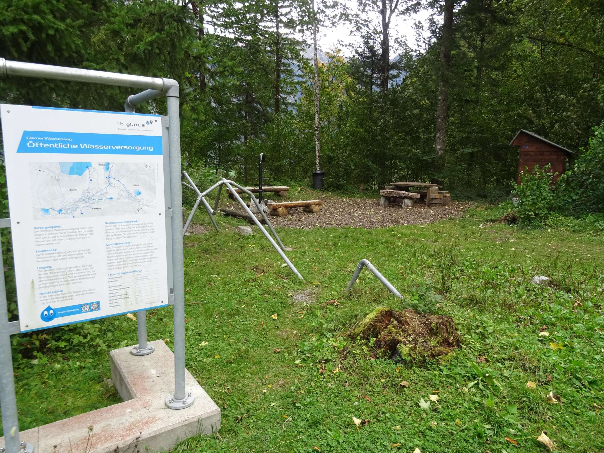 Direkt an der Feuerstelle führt der Glarner Wasserweg vorbei, der mit Schautafeln rund um das Gelände interessante Informationen um die öffentliche Wasserversorgung gibt.