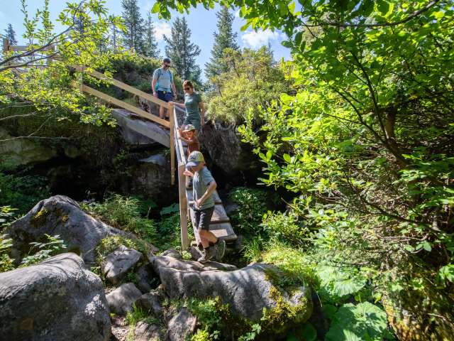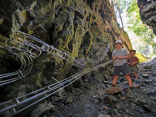 Der Zwerg Bartli mit seinem langen Bart, seiner roten Hose und seinem grünen Pullover kommt von Mitte Juni bis Oktober aus seinem Hüttli, um Familien willkommen zu heissen und ihnen seinen Wald zu zeigen. Der Weg führt vorbei am mächtigen Brummbachfall mit dem Wasserspielplatz, am kleinen Holzhaus der Tante Tiidi, welche einst dem Zwerg die Hosen flickte. Wer die Edelsteinspalte entdecken geht, wo Bartli den leuchtend roten Edelstein fand, findet noch seinen Pickel und seine Grubenlampe. Man könnte meinen, er sei soeben aus der Miniaturschlucht herausgesprungen. Vielleicht hinauf in die Höhle von Zwerg Ägiidi, wo dessen Tischchen und sein Bettchen stehen? Auch hier kann er nicht weit sein, denn die Grubenlampe flackert noch und im Tellerchen liegt noch etwas von seinem Znüni, welches Kinder für ihn bereitgelegt haben. Wenn Zwerg Bartli aber nicht zu Hause in seinem Rindenhüttli ist, dann trifft man ihn womöglich im Zwergenschloss bei der imposanten Spalte im Felsen an, dort wo der Thron des Zwergenkönigs steht, die Kerzen brennen und im Spiegelsaal die letzten Blumen vom grossen Zwergenball liegen.