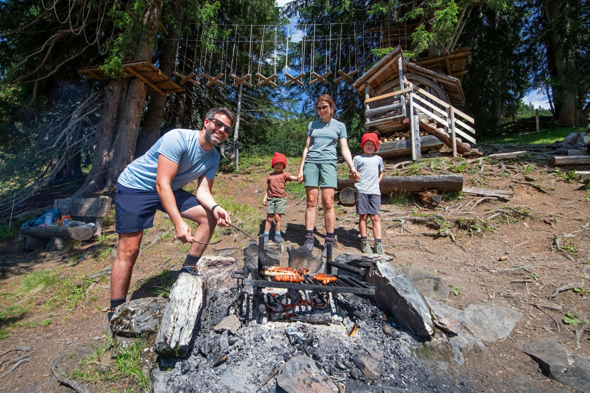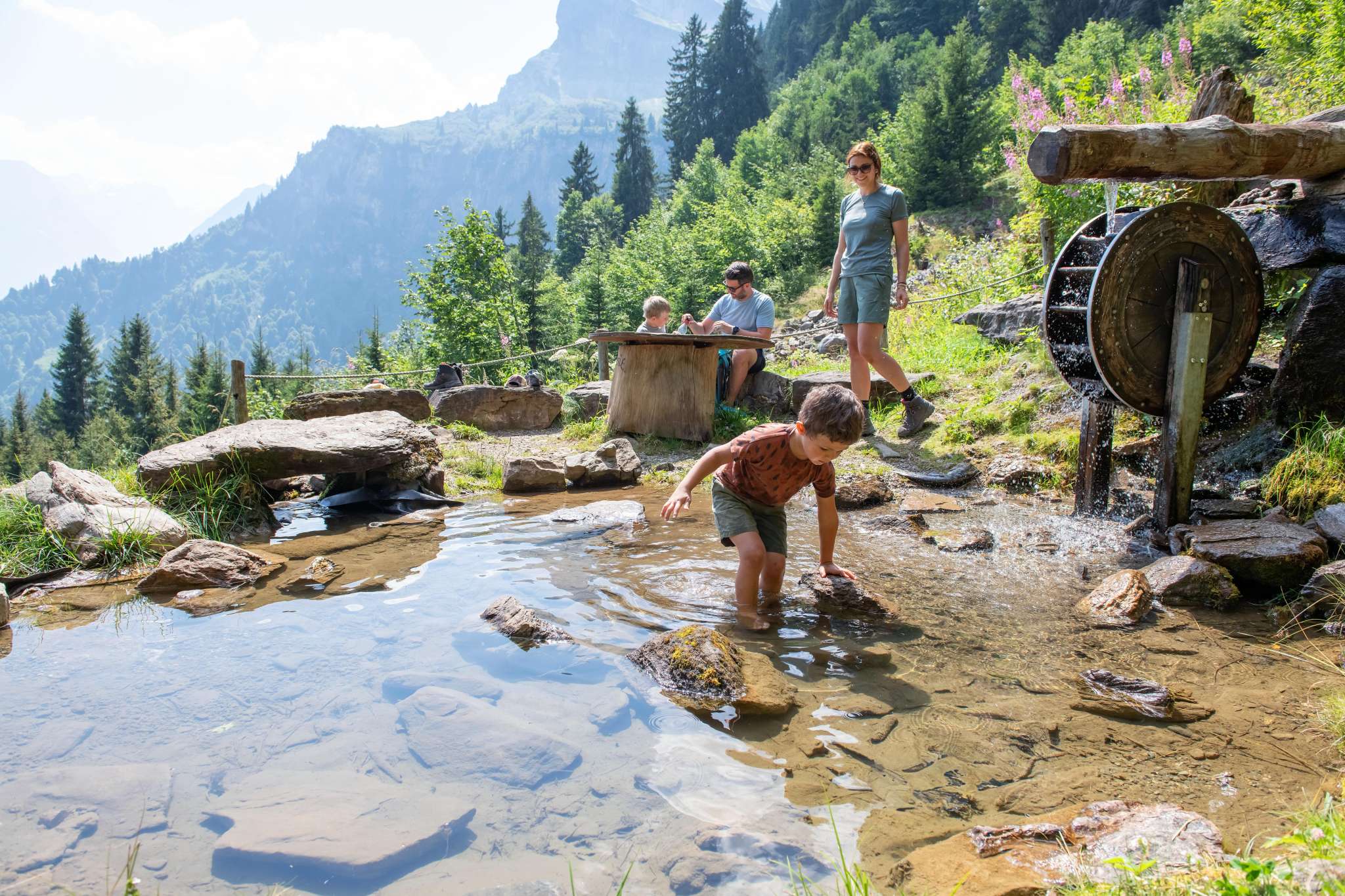 Grotzenbüel ⇒ Rindenhüttli ⇒ Zwergenturm ⇒ Zauberwald ⇒ Wasserspielplatz ⇒ Tiidis Hüsli ⇒ Musiktruhe bei der Bergstation der Braunwaldbahn
